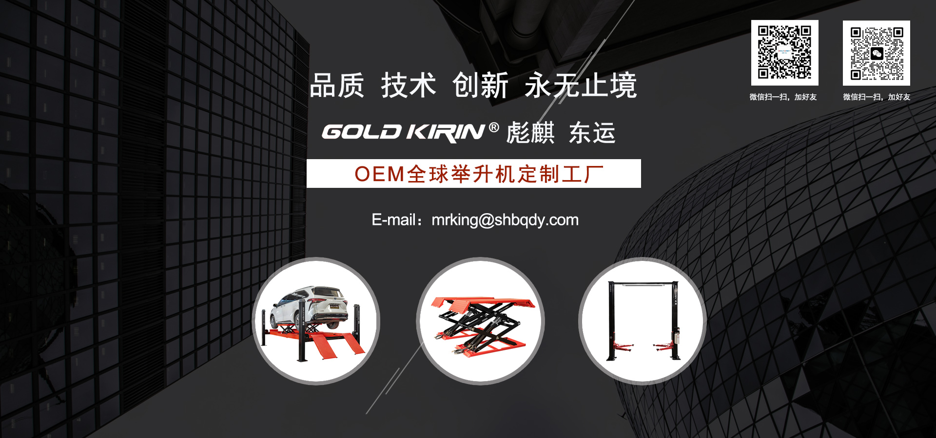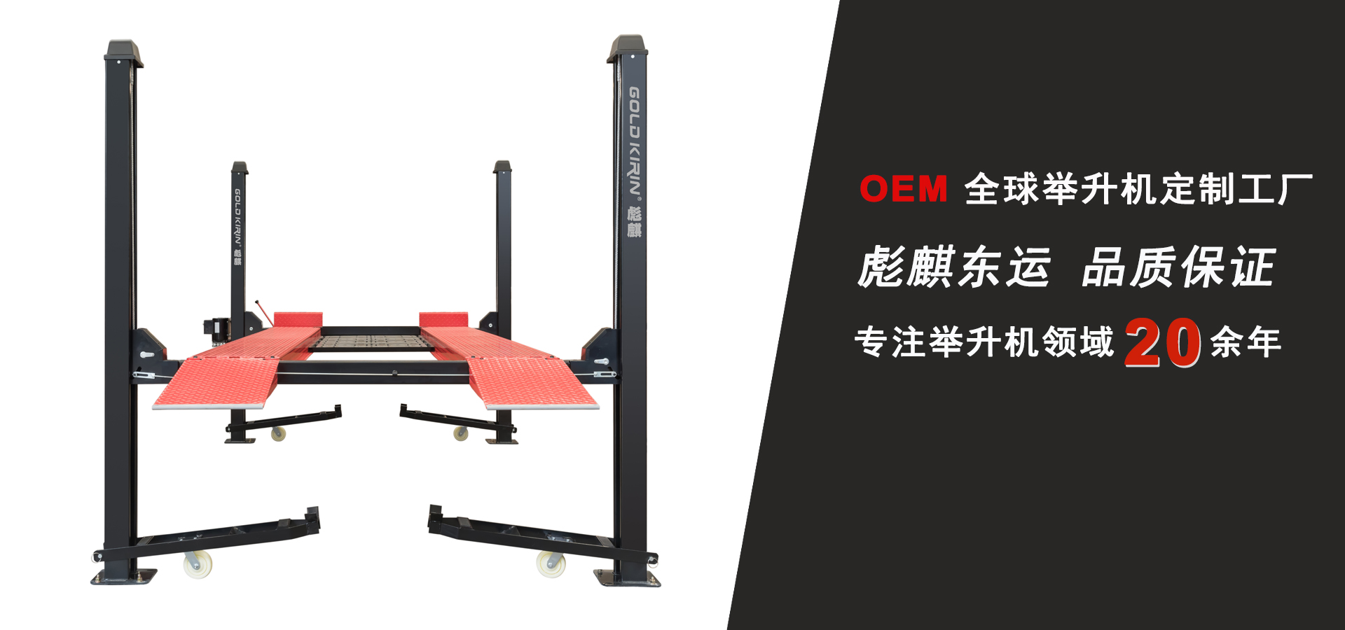 GOLD KIRIN?彪麒 東運是專注研發生產舉升設備、自動涂裝設備、電腦洗車設備的設備制造商。公司堅持“追求完美、品質取勝”的質量方針,全面推行ISO9001:2000國際質量管理標準體系,企業大部分產品已通過“CE”認證.